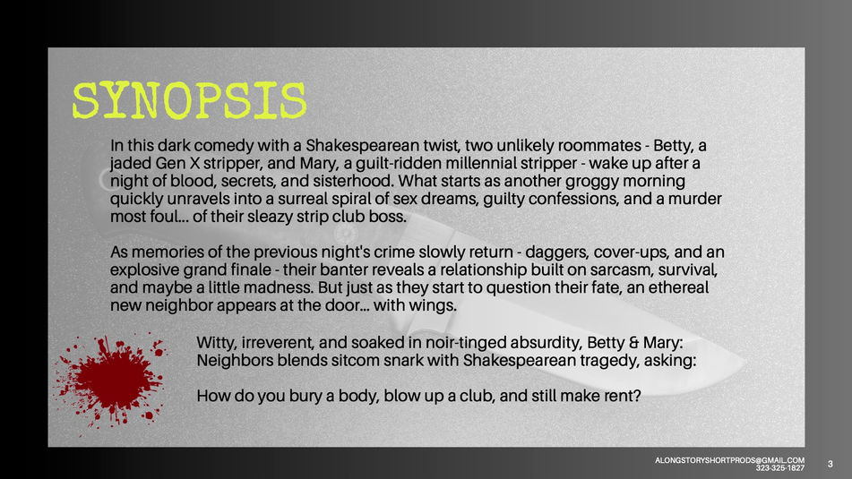 As memories of the previous night's crime slowly return - daggers, cover-ups, and an explosive grand finale - their banter reveals a relationship built on sarcasm, survival, and maybe a little madness. But just as they start to question their fate, an ethereal new neighbor appears at the door… with wings. Witty, irreverent, and soaked in noir-tinged absurdity, Betty & Mary: Neighbors blends sitcom snark with Shakespearean tragedy, asking: How do you bury a body, blow up a club, and still make rent?